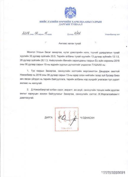 Тушаалд “Д.Нэмэхбаяр нь 2018 оны зургаадугаар сарын 13-ны өдөр олон нийтийн газар зүй бусаар биеэ авч явсан үйлдэл нь төрийн байгууллага, төрийн албаны нэр хүндийг унагасан тул үүрэгт ажлаас нь халсугай” хэмээсэн байна.