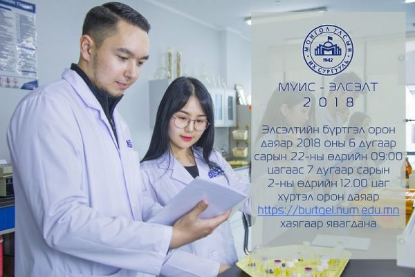 Элсэх хүсэлт гаргах: Элсэлтийн бүртгэл орон даяар 2018 оны 6 дугаар сарын 22-ны өдрийн 09:00 цагт нээж, 7 дугаар сарын 2-ны өдрийн 12.00 цагт хаах бөгөөд орон даяар https://burtgel.num.edu.mn хаягаар явагдана.
