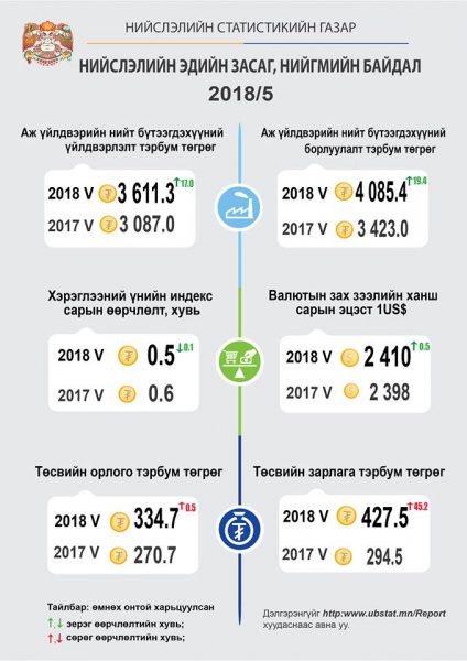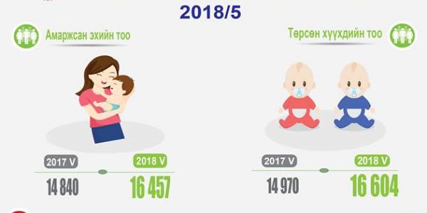 2018 оны эхний 5 сард нийслэлд 16457 эх амаржиж, 16604 хүүхэд мэндэлжээ. Үүнээс 8535 нь эрэгтэй хүүхэд, 8069 нь эмэгтэй байна. Шинэ төрсөн нийт хүүхдийн 239 нь 2 ихэр, 7 нь 3 ихэр бүртгэгджээ.
