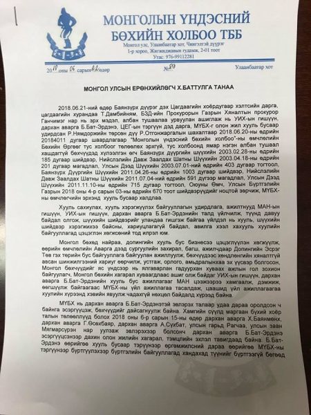 Түүнчлэн Монгол бөхөд найраа, допингийн хууль бус бизнесээ цэцэглүүлэн хөгжүүлж, өөрийн өмчлөлийн Аварга дээд сургуулийн захирал, багш, ажилчдаар Допингийн Эсрөг Төв гэх төрийн бус байгууллага байгуулан ажиллуулж, бөхчүүдээс хөндлөнгийн хяналтгүй авсан шинжилгээний хариуг өөрчилж, устгаж, орлого, амьдралынхаа эх үүсвэр болгосон, Монгол бөхчүүдийг яс үндсээр нь ялгаварлан гадуурхан хуваах ажлын гол зохион байгуулагч, Монгол бөхийн хагарал хуваагдлаас ашиг олж байдаг УИХ-ын гишүүн, дархан аварга Б.Бат-Эрдэнийн хууль бус ажиллагааг МАН цээжээрээ хамгаалж, дэмжиж, өөгшүүлж байгаагаас МҮБХ-ны үйл ажиллагаа тасалдаж, цаашид үйл ажиллагаагаа хуулийн, хэвийн явуулж чадахгүй нөхцөл байдалд хүрээд байна. Тиймээс энэ асуудалд Ерөнхийлөгч Х.Баттулга та анхаарлаа хандуулж өгнө үү гэжээ. Ингээд Ерөнхийлөгчид илгээсэн бичгийг бүрэн эхээр нь хүргэж байна.