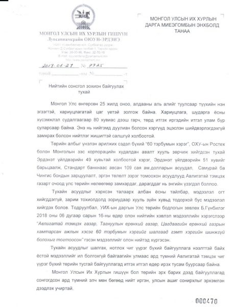 Тэгвэл “60 тэрбум”-ын хэргийн асуудлаар нээлттэй сонсгол зохион байгуулах хүсэлтийг УИХ-ын даргад өргөн барихаар болсон талаар мэдээлэл хийлээ.