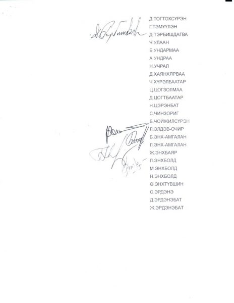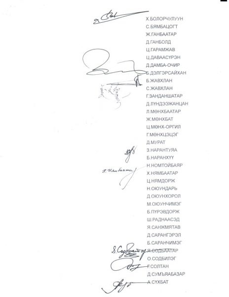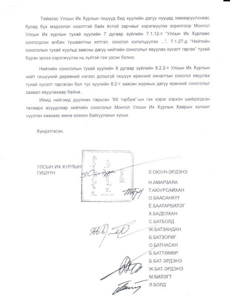 Иймд нийгэмд дуулиан тарьсан 60 тэрбумын хэрэг хэрхэн шийдэгдэх талаарх олон нийтийн сонсголыг МУ-ын Их Хурлын Хаврын ээлжит чуулган хаахаас өмнө зохион байгуулахыг шаардаж байна” гэсэн хүсэлтийг УИХ-ын даргад өргөн барина.
