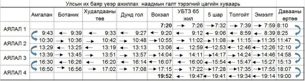 “Мишээл экспо төв” болон “Дүнжингарав худалдааны төв”-өөс “Төв цэнгэлдэх хүрээлэн” рүү 20 автобус 3 минут тутам, Рейлбусын зогсоол буюу “Урбанек”-ын урд талын “Дунд гол”-ын зогсоолоос Төв цэнгэлдэх хүрээлэн” рүү 3 автобус 10 минут тутамд явна.