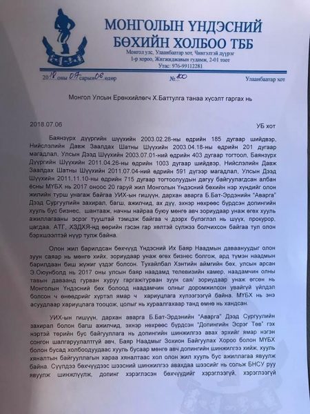 Мөн “УИХ-ын гишүүн, дархан аварга Б.Бат-Эрдэнэ болон улсын наадмыг найраа хийж мөнгө босгодог ахмад бөхчүүд нийлж өөрийн хамаарал бүхий “Допингийн Эсрэг Төв” ТББ гэгчээрээ өөрийнх нь фракцийн биш, үгэнд нь ордоггүй, найраанд ордоггүй, ид барилдах насан дээрээ яваа бөхчүүдийг допинг илэрсэн гэсэн худал дүгнэлт гаргуулж, нэр хүндэд нь халдаж, айлгаж, дарамталж, өөрийн хамаарал бүхий наадмын барилдааны будлиан, найрааг гол зохион байгуулагч, бөхчүүдийг яс үндсээр нь ялгаварлан гадуурхаж, талцуулагч Р.Даваацэрэн, Б.Цогтбаатар, С.Гантөр нараар дарамтлуулж, нөлөөлүүлж, бүртгэхээс татгалзаж, Үндэсний Их Баяр Наадмын бөхийн барилдаанд нөлөөлдөг хууль бус үйлдлүүд нь хэрээс хэтэрч байгаа тул арга буюу танд хандахад хүрч байна.