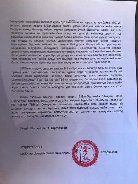 Иймд УИХ-ын гишүүн, дархан аварга Б.Бат-Эрдэнийн “Аварга” Дээд Сургуулийн захирал, багш, ажилчид, эхнэр нөхрөөс бүрдсэн “Допингийн Эсрэг Төв” гэх нэртэй ТББ-ын бөхчүүдээс допингийн шинжилгээ авах эрхийг яаралтай цуцалж, шударга, хараат бус эмч, ажилчдаас бүрдсэн, хөндлөнгийн хяналттай, ашиг сонирхлын зөрчилгүй байгууллагаар уг шинжилгээг авахуулж өгөхөд анхаарал хандуулж, шийдвэрлэж өгнө үү” гэжээ.