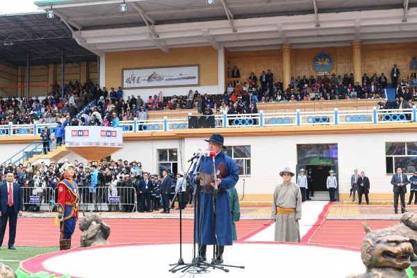 Монгол Улсын Ерөнхийлөгч Х.Баттулга үг хэлж дууссаны дараа Төрийн есөн хөлт, цагаан туганд хүндэтгэл үзүүлснээр Үндэсний их баяр наадам албан ёсоор эхлэв.