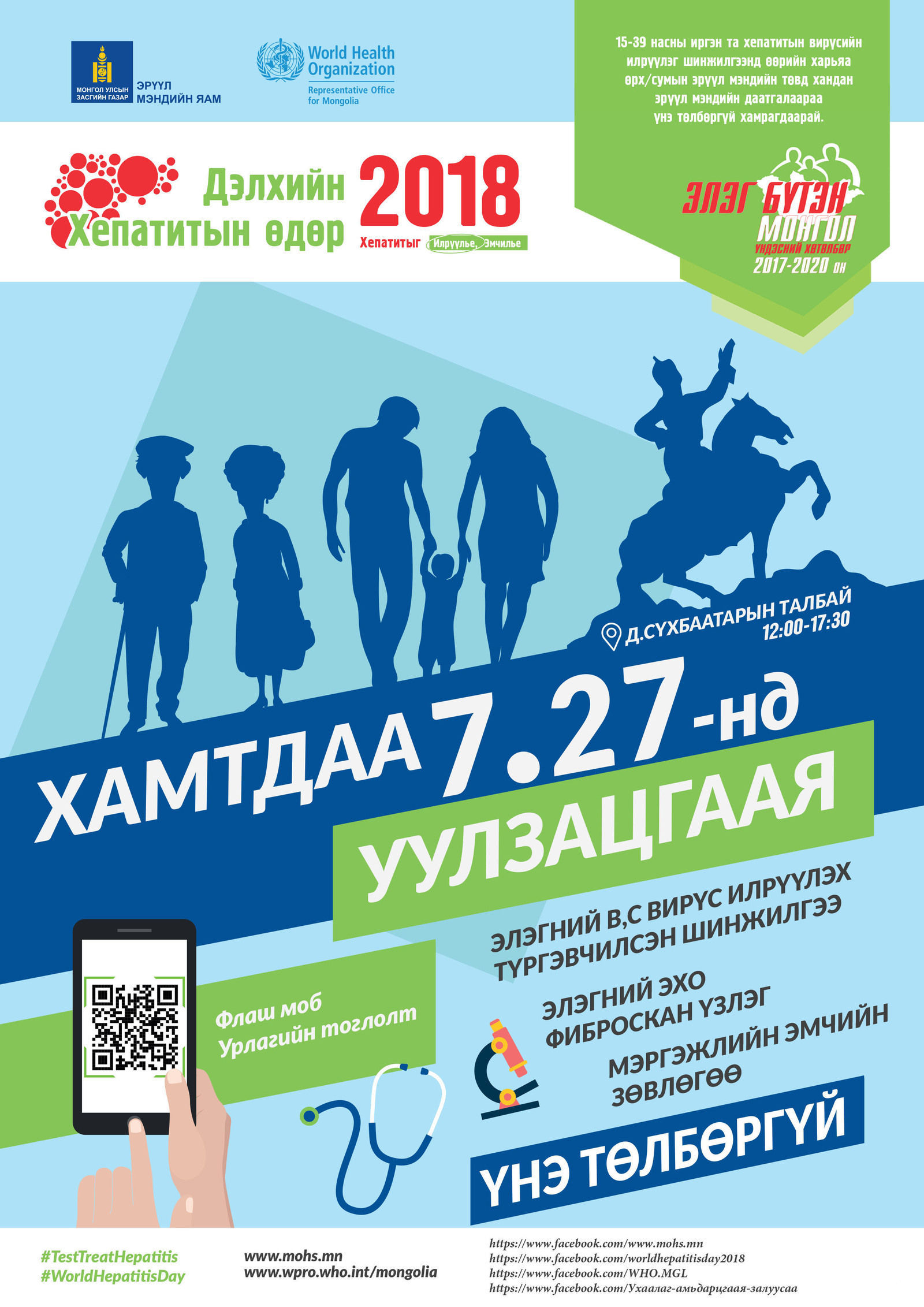 Мөн Дэлхийн Хепатитын өдөр энэ сарын 27 буюу өнөөдөр тохиож байгаатай холбогдуулан Д.Сүхбаатарын талбайд 12:00-17:30 цагт элэгний B, С вирүс илрүүлэх түргэвчилсэн шинжилгээг үнэ төлбөргүй хийх гэж байна. Мөн энэ үеэр элэгний эхо фиброскан үзлэг хийж, мэргэжлийн эмч зөвлөгөө өгнө.