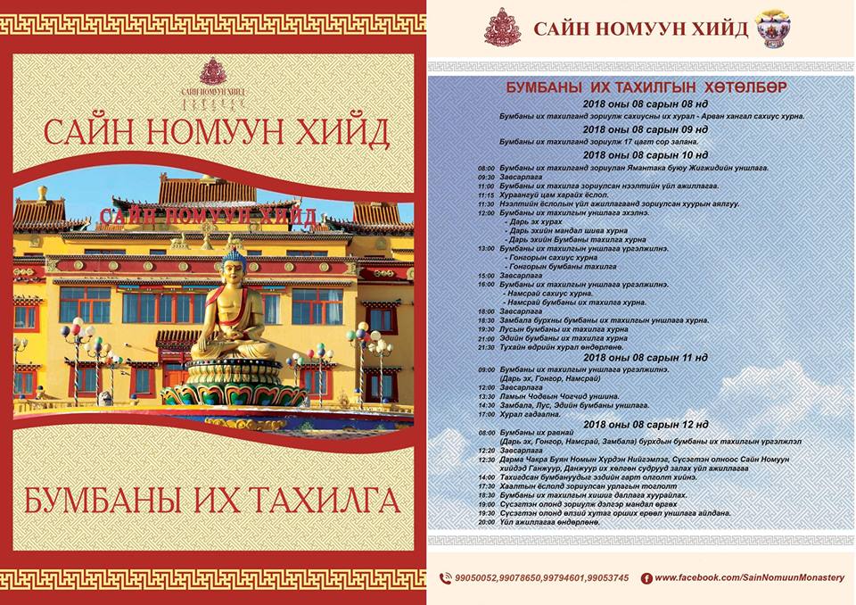08:00 Бумбаны их тахилгын уншлага Гонгор, Намсрай бурхдын бумбаны тахилга.