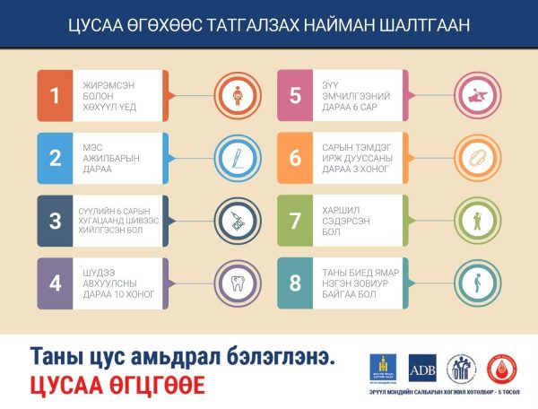 Хэрвээ та цусаа өгч, бусдад амьдрал бэлэглэж, донор болсон бол цусаа өгсний дараа ямар дэглэм барих, ямар зүйл хийх ёстой, ямар зүйл хориглодгийг мэддэг байх хэрэгтэй. Цус сэлбэлт судлалын үндэсний төвийн Чанарын Албаны дарга Т.Алимаа ингэж зөвлөлөө.