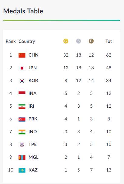 Жагсаалтын хоёрдугаар байрт Япон улс 12 алт, 18 мөнгө, 18 хүрэл нийт 48 медальтайгаар бичигдэж байгаа бол Өмнөд Солонгос улс 8 алт, 12 мөнгө, 14 хүрэл медалийн эзэн болж жагсаалтын гуравдугаар байрыг эзэлж байна.