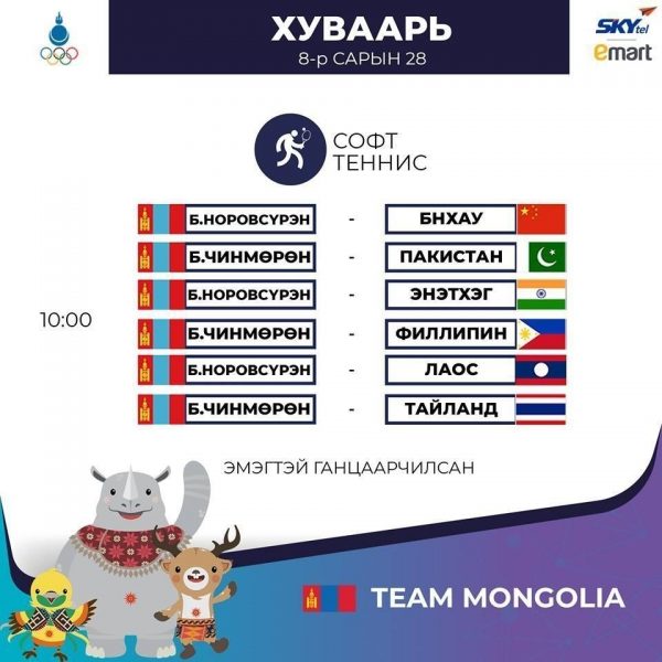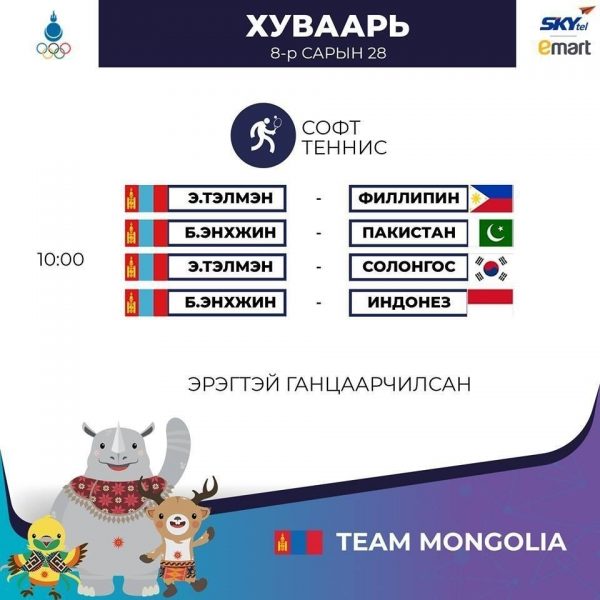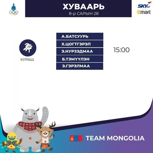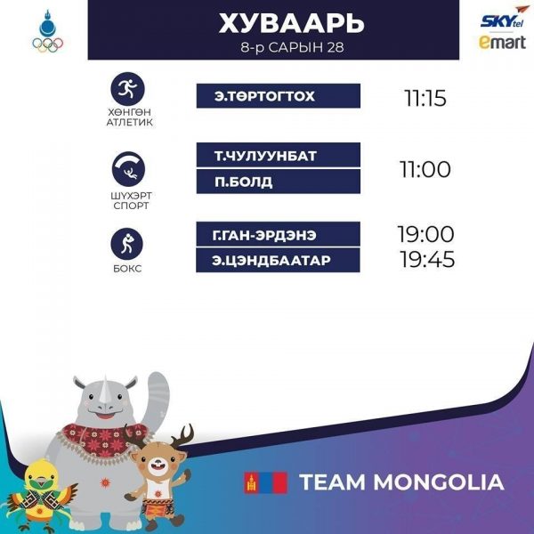 Өнөөдөр буюу наймдугаар сарын 28-ны өдрийн Монголын баг тамирчдын тэмцээний хуваарийг хүргэж байна: