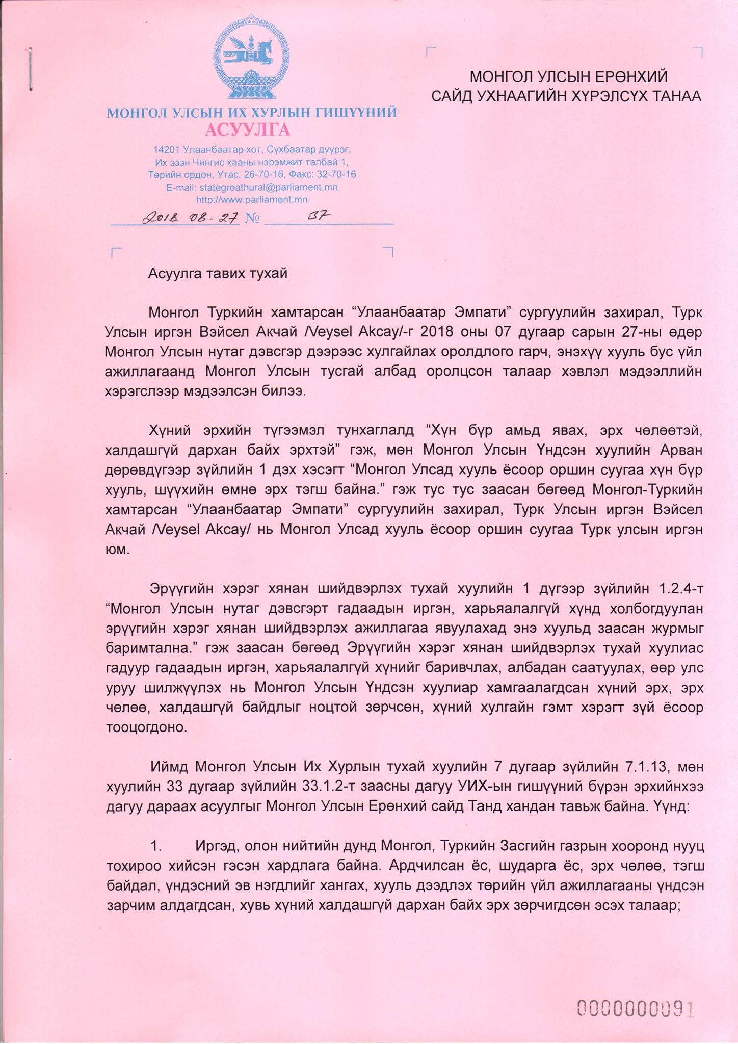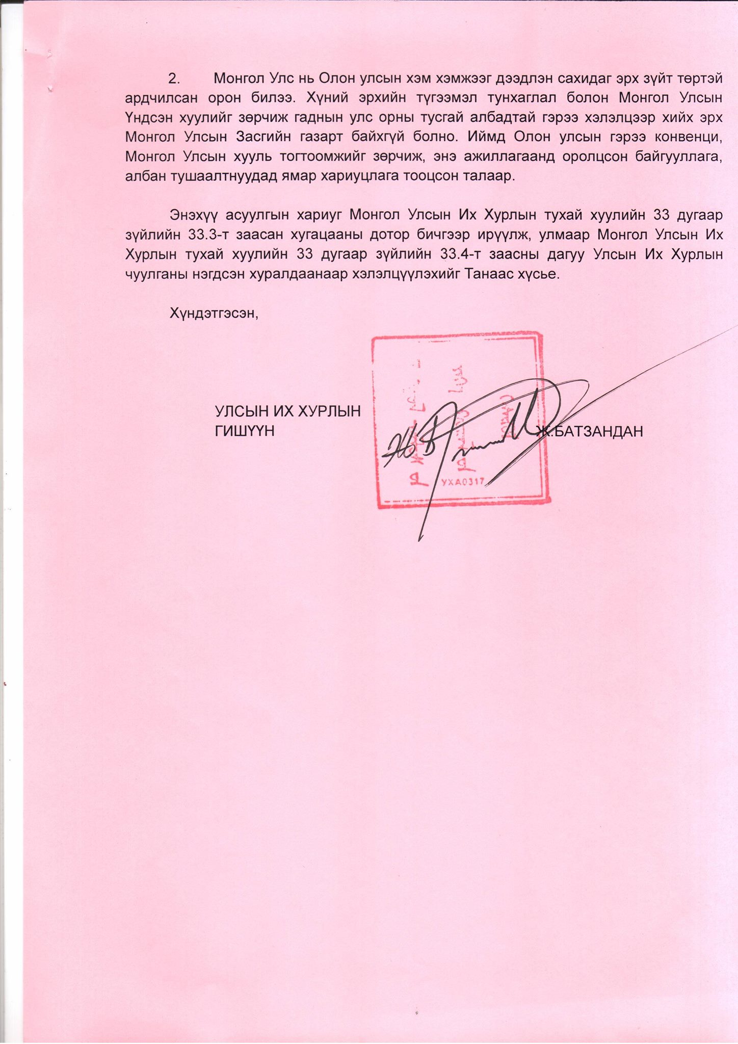 Тиймээс УИХ-ын тухай хуулийн долдугаар зүйлийн 3.1.12, 33.1.2-т заасны дагуу УИХ-ын гишүүний бүрэн эрхийн дагуу энэхүү асуулгыг тавьж буйгаа тодотгожээ. Тэрээр асуулгын хариуг УИХ-ын чуулганаар хэлэлцүүлэхийг хүссэн байна.
