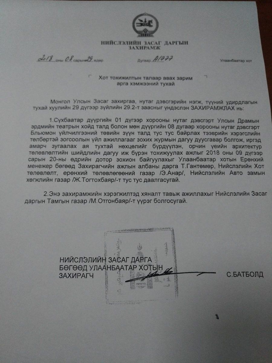 Сүхбаатар дүүргийн 1 дүгээр хорооны нутаг дэвсгэр Улсын Драмын Эрдмийн театрын хойд тал, мөн дүүргийн 8 дугаар хорооны нутаг дэвсгэр Блюмон үйлчилгээний төвийн зүүн талд байрлах төлбөртэй авто зогсоолуудын үйл ажиллагааг дуусгавар болгохыг даалгажээ.