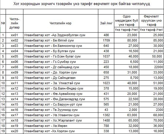 Тухайлбал, хамгийн ойр чиглэл буюу Төв аймгийн Зуунмод чиглэлд 300 төгрөгөөр, хамгийн хол чиглэл буюу Ховд аймгийн Булган сум чиглэлд 9500 төгрөгөөр нэмэгдэх тооцоо судалгааг гаргасан байна.