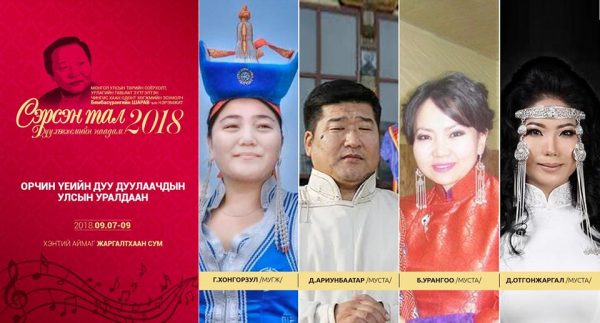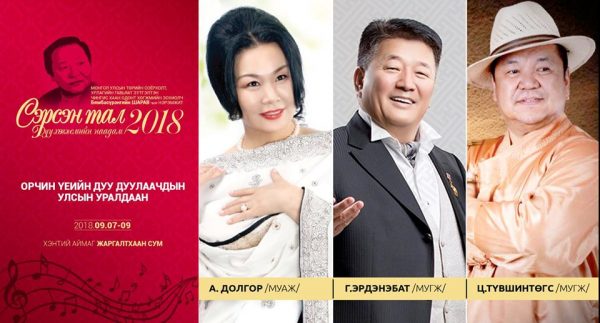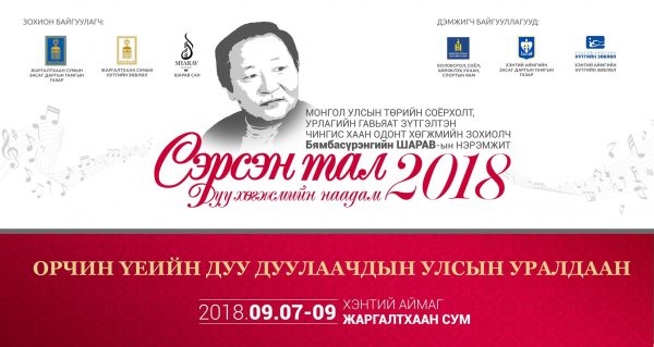 Монгол Улсын Төрийн шагналт, Урлагийн гавьяат зүтгэлтэн, “Чингис хаан” одонт хөгжмийн зохиолч Бямбасүрэнгийн Шаравын нэрэмжит СЭРСЭН ТАЛ дуу хөгжмийн наадам 2018 хүрээнд Орчин үеийн дуу дуулаачдын улсын уралдаан Хэнтий аймгийн Жаргалтхаан суманд энэ сарын7-нээс 9ний өдрүүдэд зохион байгуулагдах гэж байна. Орчин үеийн дуу дуулаачдын улсын уралдааны нээлт энэ сарын 8-ны өдөр болно.