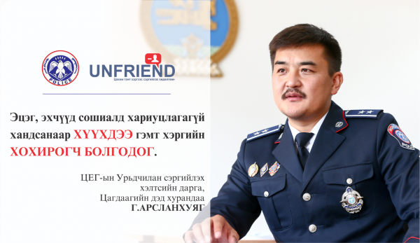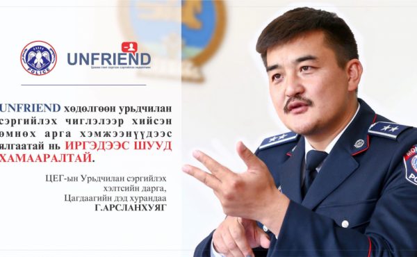 Сошиал хэрэглэгчиддээ эрх зүйн болон интернэт хэрэглээний мэдлэгийг өгөх, өөрийгөө болон гэр бүлээ хамгаалах хандлагыг нь нэмэгдүүлэх, хариуцлагатай хэрэглээг бий болгож учирч болох эрсдлээс урьдчилан сэргийлэх зорилгоор ХЗДХЯ, Монгол Улс дахь гэмт хэргээс урьдчилан сэргийлэх ажлыг зохицуулах зөвлөл, Цагдаагийн ерөнхий газар хамтран нэг сарын хугацаатай “Unfriend хөдөлгөөн” нэгдсэн арга хэмжээг улс орон даяар зохион явуулж байна. Unfriend хөдөлгөөний хувьд өнгөрсөн хугацаанд зохион байгуулсан хэд хэдэн арга хэмжээнээс ялгаатай нь иргэдээс шууд хамааралтай, иргэн-гэр бүлийн гишүүд рүү чиглэсэн арга хэмжээ юм. Иргэдээс шууд хамааралтай гэж тодотгохын учир нь “Unfriend хөдөлгөөнийг ойлгож, дэмжсэнээр иргэн та 5-хан минутын дотор өөрийгөө болон гэр бүлийн гишүүдээ хамгаалах, энэ төрлийн гэмт хэргээс урьдчилан сэргийлэх бүрэн боломжтой” гэдгийг нь ойлгуулах нь энэ хөдөлгөөний гол зорилго. Тухайлбал, иргэн та 5-хан минутын дотор найзын жагсаалтаасаа танихгүй, мэдэхгүй, нэр нүүрээ нууцласан этгээдүүдийг хасах, хувийн оруулсан мэдээллээ эргэн нэг хянах, үр хүүхэд, гэр бүлийн мэдээллээ устгах, сошиал аппликейшны тохиргоог хувийн мэдээллээ хамгаалах горимд тааруулах зэрэг маш энгийн алхмуудаар цахим гэмт хэргийн хохирогч болохоос урьдчилан сэргийлэх бүрэн боломжтой юм. Дээрх алхмуудыг хийсэнээр урьдчилан сэргийлэх үр дүн тэр даруй гарна. Өөрөөр хэлбэл та болон таны гэр бүлийн гишүүд хэн нэгэн халдагч этгээдээс хувийн мэдээллээ хамгаалах, тэдэнтэй холбогдохгүй, харьцахгүй байх боломж бүрдэж байгаа юм.