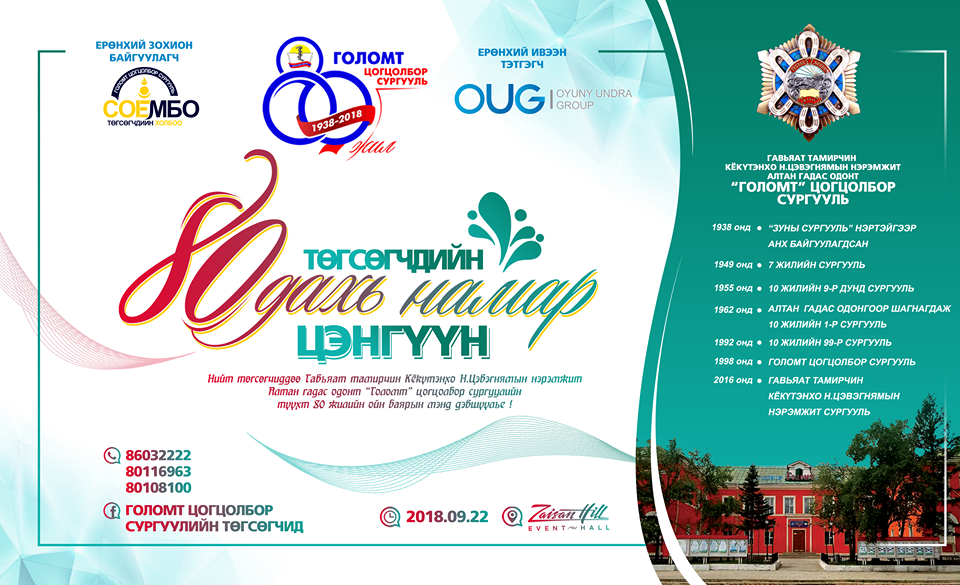 Шинэхэн байгуулагдсан Голомт цогцолбор сургуулийн төгсөгчдийн “Соёмбо” холбоо нь төрөлх сургуулийнхаа түүхт 80 жилийн ойг тохиолдуулан нийт төгсөгчдөө уриалан “80 дахь намар” дурсамж цэнгүүнийг 2018 оны 09 сарын 22-ны 18:00 цагт Зайсан хилл эвент холл-д зохион байгуулахаар болжээ.