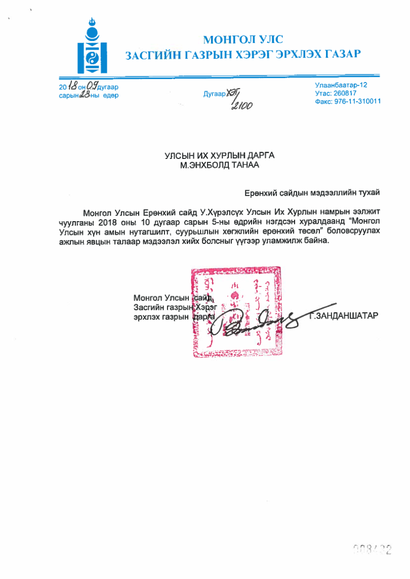 Улсын Их Хурлын 2018 оны 10 дугаар сарын 05-ны өдрийн чуулганы нэгдсэн хуралдаанд Монгол Улсын Ерөнхий сайд У.Хүрэлсүх “Монгол Улсын хүн амын нутагшилт, суурьшлын хөгжлийн ерөнхий төсөл боловсруулах ажлын явцын талаар” хийх мэдээлэл
