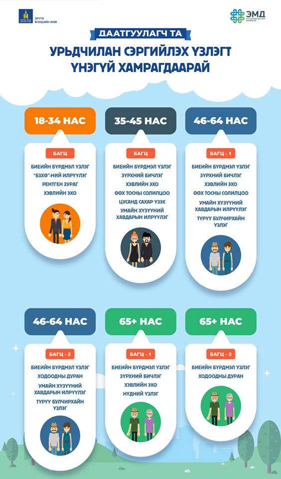 Эрүүл мэндийн яамнаас 18-с дээш насны даатгуулагч бүрийг Эрүүл мэндийн урьдчилан сэргийлэх үзлэгт үнэ төлбөргүй хамруулахаар болсон.