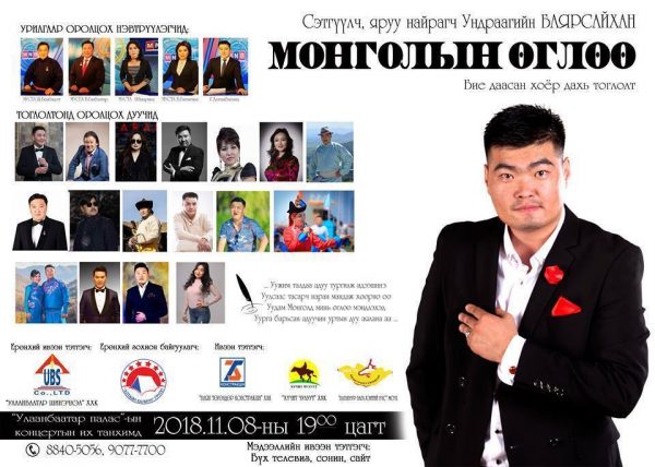 -Энэ удаагийн тоглолтын маань ерөнхий ивээн тэтгэгчээр “Улаанбаатар Шинэчлэл” компани ажиллаж байгаа. Ивээн тэтгэгчээр “Баян төгөлдөр констракшн”, “Хүчит чулуу” компани, “Монгол 3D шалавч”, “Багануур Бага-Хэнтийн бүс” морин спорт уяачдын холбоо ажиллаж байна. Дээрх байгууллагын удирдлагууд миний дуунуудыг сонсох дуртай юм билээ. Тиймдээ ч хамтарч ажиллах саналыг минь сайхан хүлээж авсан байх. Зарим нь өглөө болгон “Монголын өглөө” дууг сонсоод ажилдаа явахад хийморийн сан тавиулсан мэт ажил сайхан бүтдэг гэсэн шүү.