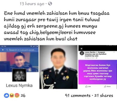 Цагдаагийн алба хаагчийн зургийг ашиглан цахимаар луйвар хийжээ. Тодруулбал, н.Болор-Эрдэнэ гэгч нь lexus Nymka, Erdene Bileg зэрэг хаяг хуурамчаар нээн цагдаагийн ажилтны гэрэл зургуудыг ашиглан “Жолооны эрх сэргээх, ангилал дарж өгнө” гэх зэргээр зар тавьж, чатаар болон утсаар харилцжээ. Улмаар 2017 оны тавдугаар сарын 1-нээс хойш нийт 500 орчим иргэнээс 80 гаруй сая төгрөгийг залилсан болохыг илрүүлжээ.