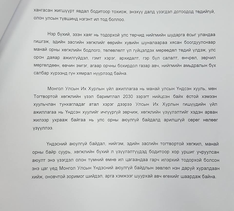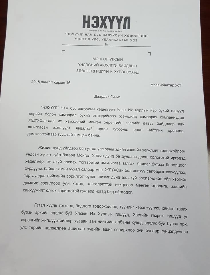 Тус бичигт Монгол Улсын Үндэсний аюулгүй байдлын зөвлөлийг яаралтай хуралдуулахыг шаардсан байна гэж Засгийн газрын Хэвлэл мэдээлэл, олон нийттэй харилцах хэлтсээс мэдээллээ.