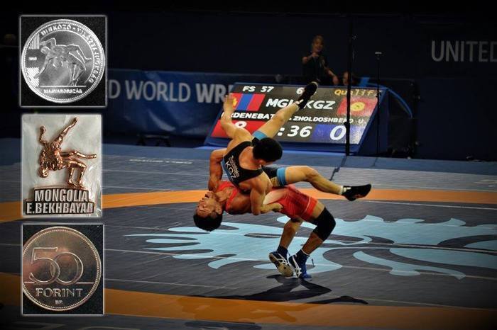 Тэгвэл “Будапешт-2018” чөлөөт бөхийн ДАШТ-нд зориулсан 50 форинтийн мөнгөн зоосыг саяхнаас гүйлгээнд гаргасан бөгөөд тус зоосонд Монгол Улсын гавьяат тамирчин Э.Бэхбаярын “Парис-2017” ДАШТ-д хийсэн шилдэг барилдаан, мэхийг мөнхөлжээ.