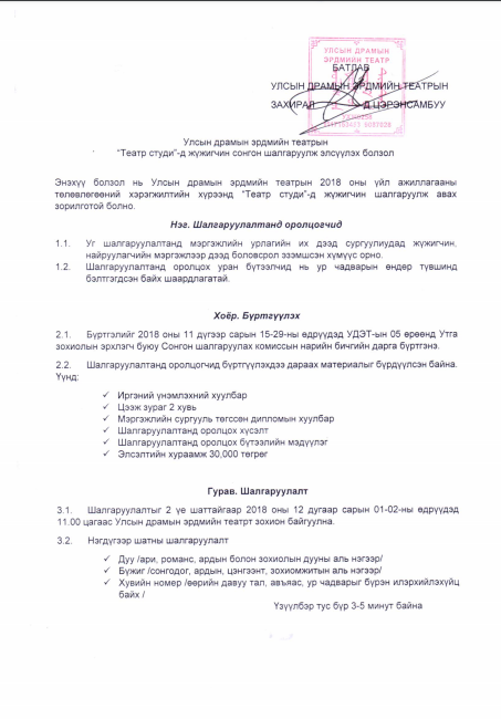Харин шалгаруулалт хоёр үе шаттай бөгөөд нэгдүгээр үед бүжиг, дуу, хувийн номер, хоёрдугаар үед монологи, жүжгийн хэсэг, хошин үзүүлбэр багтах аж. “Театр студи”-ийн шалгаруулалт арванхоёрдугаар сарын 1-2 -ны өдрүүдэд Улсын Драмын Эрдмийн театр зохион байгуулагдана.