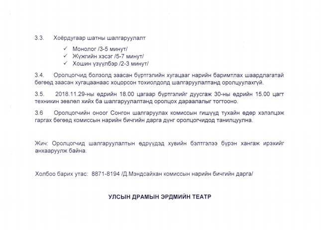 Д.Нацагдоржийн нэрэмжит, Улсын Драмын Эрдмийн Театр “Театр Студи”–ийн жүжигчинг сонгон шалгаруулахаар болсон байна. Энэхүү шалгаруулалтад мэргэжлийн урлагийн их дээд сургуулиудад жүжигчин найруулагчийн мэргэжлээр дээд боловсрол эзэмшсэн хүмүүс хамрагдах боломжтой аж. Шалгаруулалтын бүртгэлийг арваннэгдүгээр сарын 29-ыг дуустал УДЭТ-ын 05 өрөөнд бүртгэнэ.