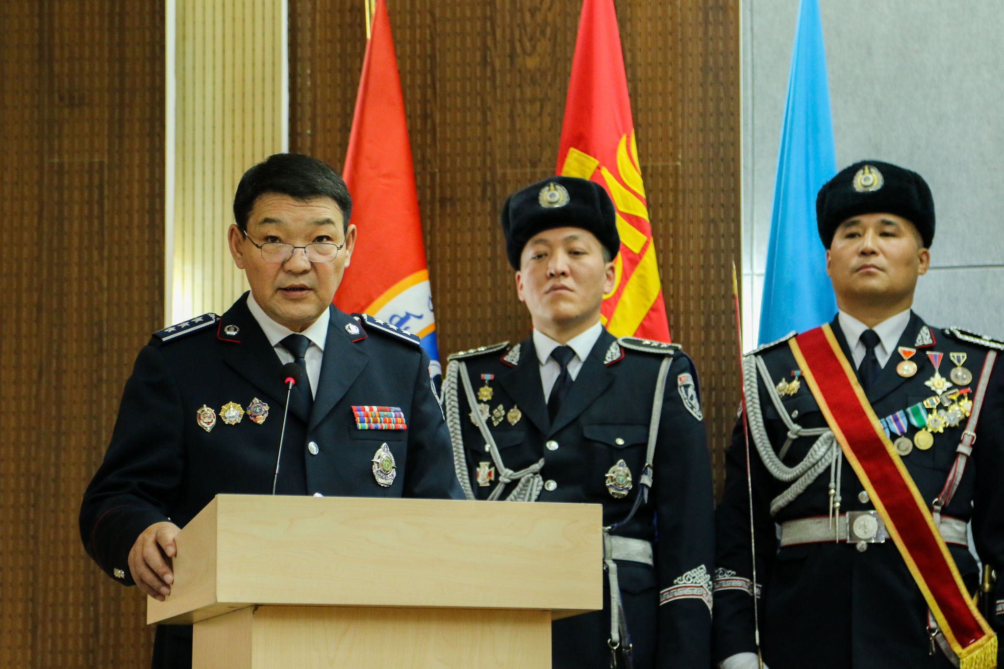 Цагдаагийн ерөнхий газрын дарга, дотоодын цэргийн командлагч, цагдаагийн хурандаа С.Баатаржав“1924 оны 11 дүгээр сарын 26 ны өдөр Улсын анхдугаар их хурлаар анхны Үндсэн хуулийг баталж “Бүх Монгол Улсыг үүнээс хойш Бүгд Найрамдах бүрэн эрхтэй Ард улс” гэж зарласнаас эдүгээр 94 жилтэйгээ золгож байна. Монголчууд бид Улс тунхагласны баярыг хотол олноороо тэмдэглэдэг бөгөөд энэхүү баярыг тохиолдуулан цэрэг, цагдаагийн цол шагналаа гардуулсаар ирсэн түүхэн уламжлалтай билээ. Өргөсөн тангарагтаа үнэнч байж, хуулиар хүлээсэн үүргээ нэр төртэй биелүүлэн ажиллаж байгаа цагдаа, дотоодын цэргийн байгууллагын алба хаагчдад цол олгож шагнал гардууллаа.