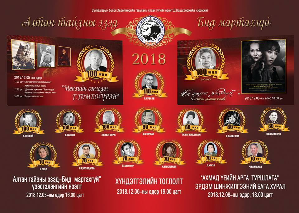 Энэ жил драмын театрын гавьяат жүжигчин Л.Лувсан110 жил, Хөдөлмөрийн баатар, Төрийн шагналт, Ардын жүжигчин Г.Гомбосүрэн 100 жил, Төрийн шагналт, Ардын жүжигчин Э.Оюун 100 жил, Ардын жүжигчин Б.Лоовой 100 жил, Соёлын тэргүүний ажилтан Д.Байдий 100 жил, З.Цэвэгдорж 100 жил, Ардын жүжигчин А. Очирбат 90 жил , Соёлын тэргүүний ажилтан Ц.Нацагням 80 жил, С.Цэрэндорж 80 жил, Төрийн соёрхолт, Ардын жүжигчин Н.Сувд, Ардын жүжигчин П.Цэрэндагва, Соёлын тэргүүний ажилтан Ё.Гантөмөр,Ч.Ранаажав, О.Итгэл, Х.Нансалмаа нарын 70 насны ой тохиож байгаа юм.