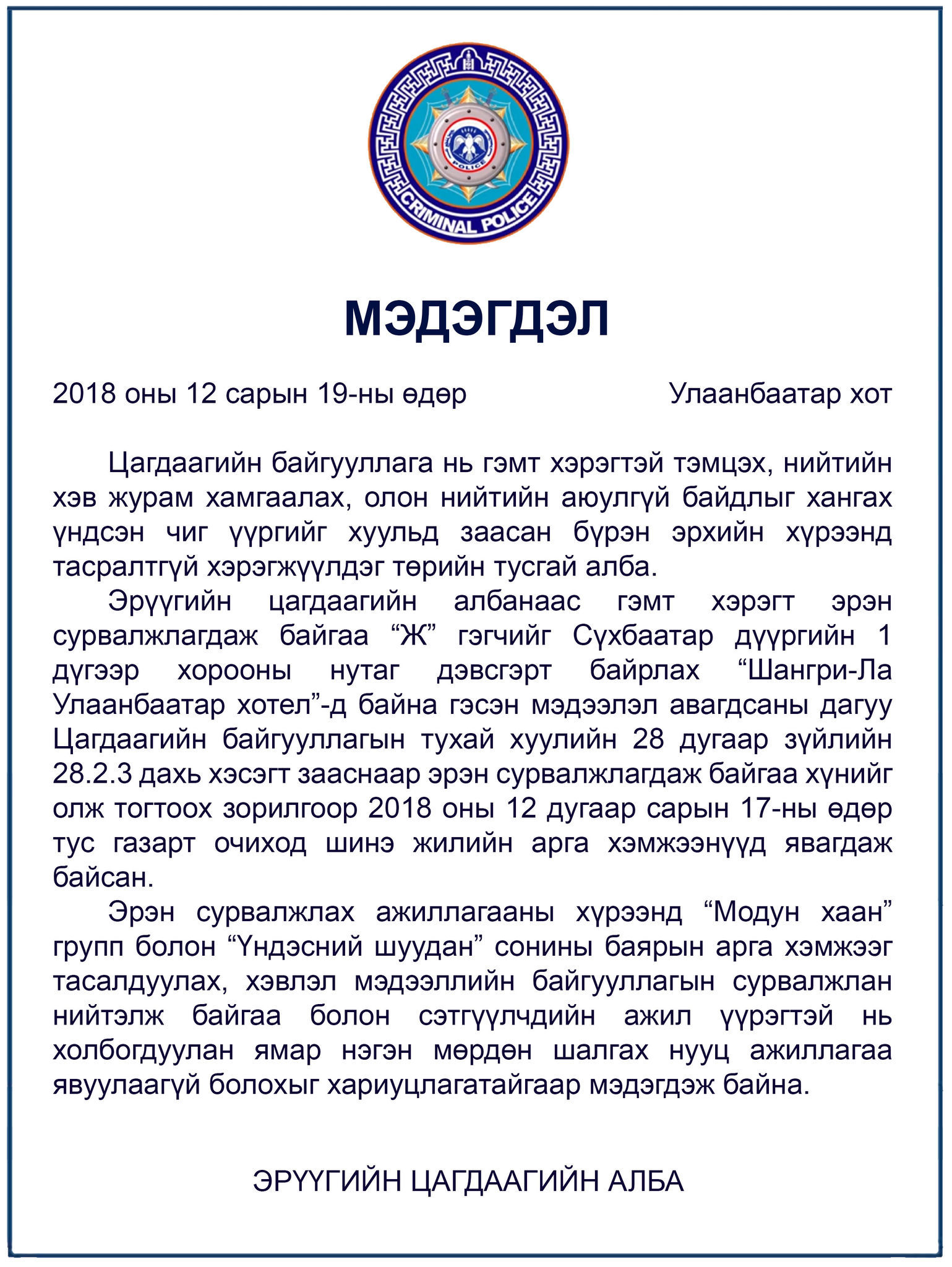 “Үндэсний шуудан” сонины редакцаас Цагдаагийн ерөнхий газрын дарга С.Баатаржавд хандан байгууллагын баярын үйл ажиллагаанд зөвшөөрөлгүй нэвтэрч, гэрэл зураг дарж, гүйцэтгэх ажиллагаа явуулсан тухайдаа тайлбар хийхийг хүссэн мэдэгдлийг гаргасан. Үүнд Эрүүгийн цагдаагийн албанаас хариу мэдэгдэл гаргажээ.
