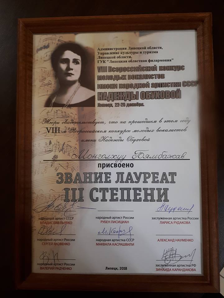 Тэгвэл Зөвлөлт холбоот улсын ардын жүжигчин Н.А.Обуховагийн нэрэмжит олон улсын дуурийн дуулаачдын VIII уралдаан ОХУ-д 12-р сарын 22-25-ны өдрүүдэд зохион байгуулагдлаа. Н.А.Обуховагийн нэрэмжит олон улсын дуурийн дуулаачдын VIII уралдаанд Монгол Улсаа төлөөлөн оролцсон Улсын филармонийн гоцлол дуучин Б.Монголхүү гуравдугаар байрт шалгарсан байна.