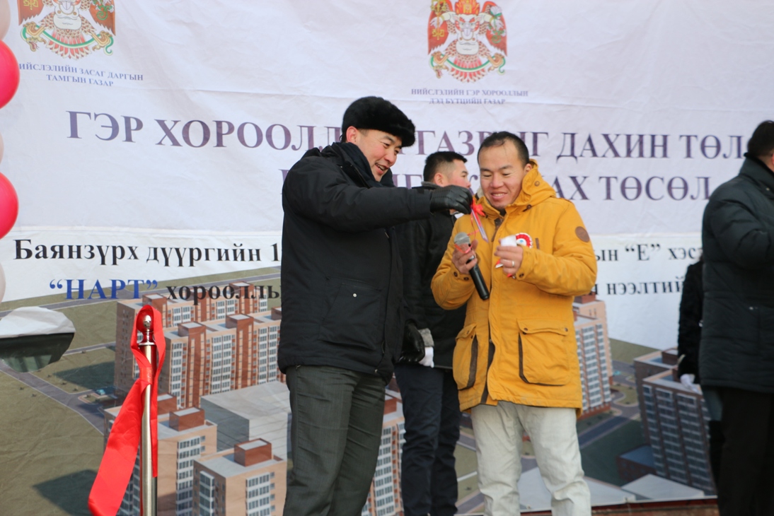 Нийслэлийн Засаг даргын албан үүргийг түр орлон гүйцэтгэгч Ж.Батбаясгалан, нийслэлийн Засаг даргын Дэд бүтцийн хөгжлийн асуудал хариуцсан орлогч П.Баярхүү, нийслэлийн ИТХ-ын Ажлын албаны дарга Б.Батбямба тэргүүтэй албаны хүмүүс өчигдөр гэр хорооллын дахин төлөвлөлтийн төслийн хүрээнд Сүхбаатар дүүргийн 11 дүгээр хороолол орчимд “Пример инвестмент” ХХК-ийн барьсан 60 айлын орон сууц, Баянзүрх дүүргийн 14 дүгээр хороололд барьсан “Зургаан талт” компанийн ашиглалтад оруулсан 120 айлын орон сууцны нээлтийн үйл ажиллагаанд оролцож, газраа чөлөөлсөн иргэдэд байрны түлхүүрийг нь гардуулан өглөө.