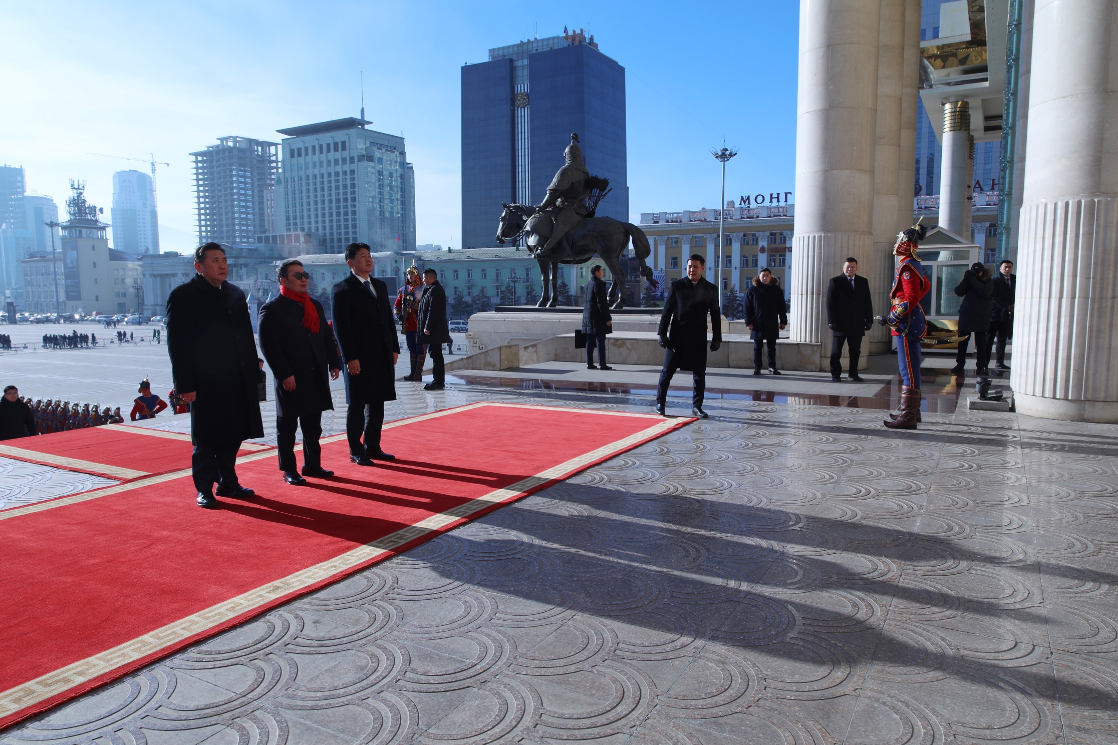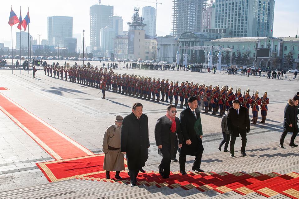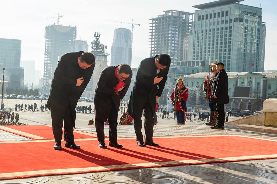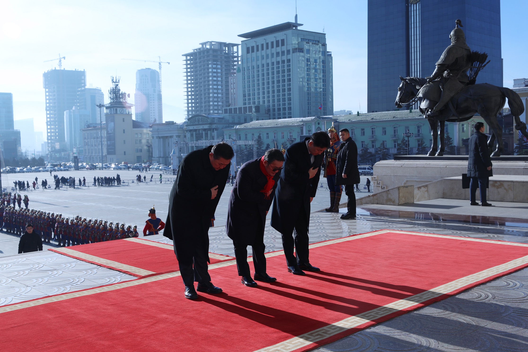 Их эзэн Чингис хааны хөшөөнд хүндэтгэл үзүүлэх ёслолд УИХ-ын дарга М.Энхболд, Ерөнхий сайд У.Хүрэлсүх болон иргэдийн төлөөллүүд оролцов.