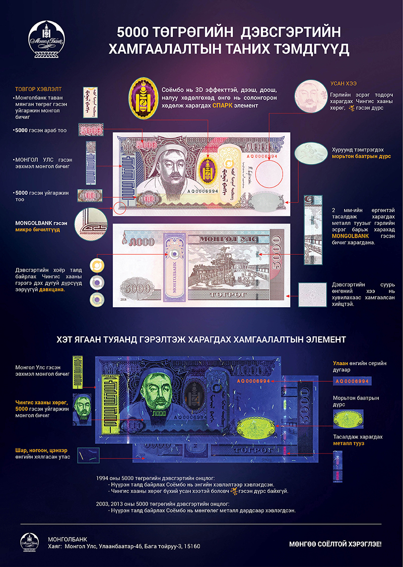 Шинэ таних тэмдэгтэй болсон 5000 төгрөгийн дэвсгэртийн хувьд нүүрэн талд байрлах Соёмбонд сүүлийн үеийн дэвшилтэт технологиор хийсэн 3-н хэмжээст хөдөлгөөнтэй, дээш, доош налуу хөдөлгөхөд өнгө нь солонгорч харагдах Спарк бэхэн элемент оруулж өгсөнөөр иргэд энгийн нүдээр хараад жинхэнэ тэмдэгтийг хуурамчаас ялгаж танихад хялбар болсон.