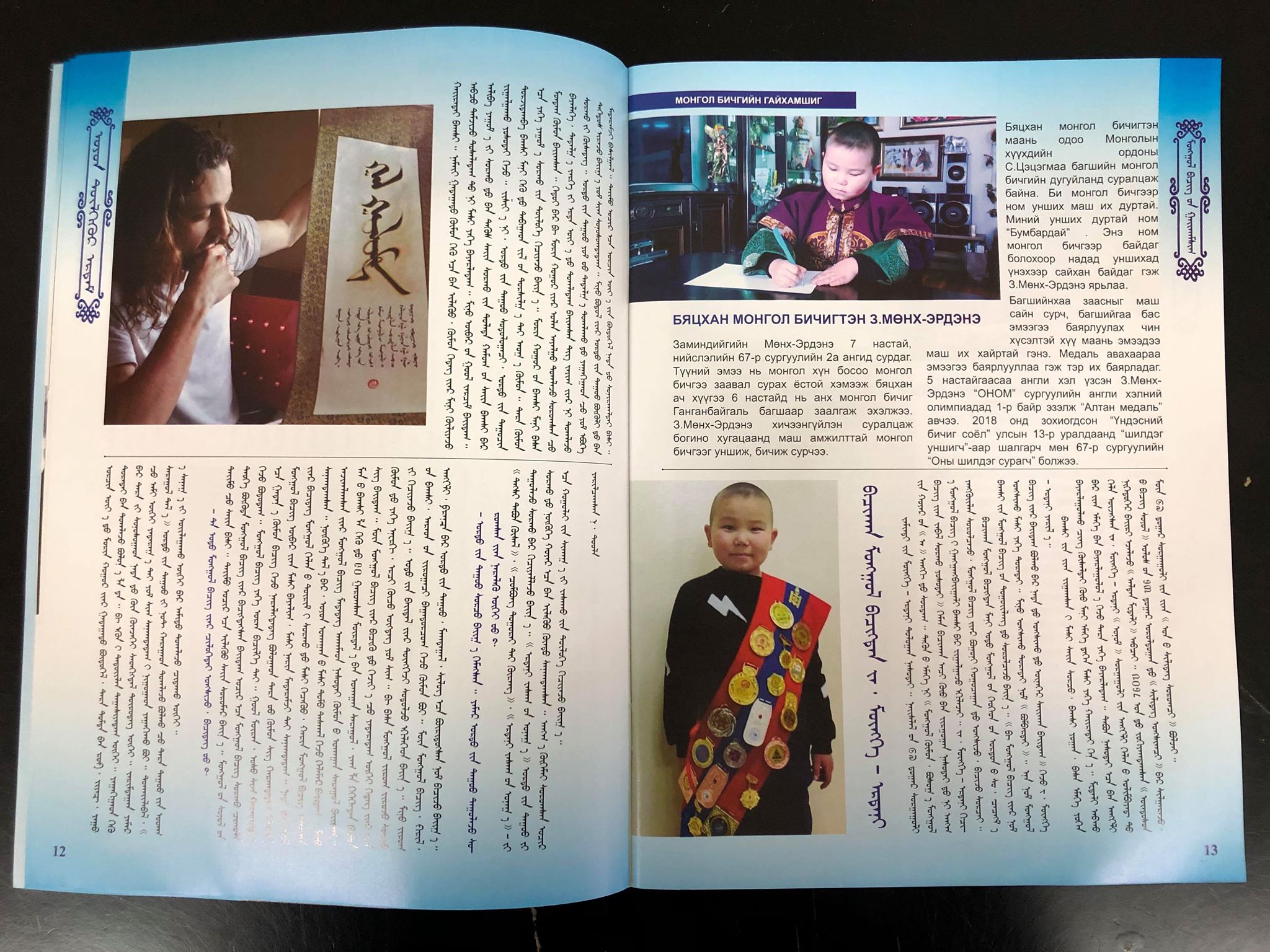 1000 гаруй жилийн түүхтэй монгол бичгийн тухай, Хэл иргэншлийн дээд сургуулийн оюутан, Франц Улсын иргэн Стив Моррелийн: Монгол бичиг хүнд их энерги, эрч хүч өгдөг нэртэй ярилцлага, Уран бичээч Д.Батбаярын тухай “Тэнгэрийн бичиг амилуулагч” хөрөг нийтлэл, калиграфи буюу уран бичлэгийн тухай нийтлэжээ.