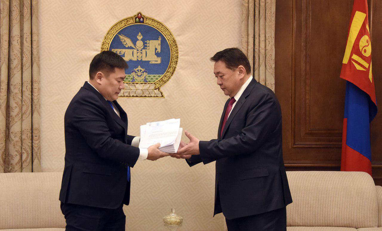 УИХ-ын гишүүн Л.Оюун-Эрдэнэ, Т.Аюурсайхан, Ж.Батзандан, Л.Болд, Х.Нямбаатар нар УИХ-ын даргыг албан тушаалаас нь чөлөөлөх талаарх тогтоолын төслийг УИХ-ын дарга М.Энхболдод өргөн барилаа.