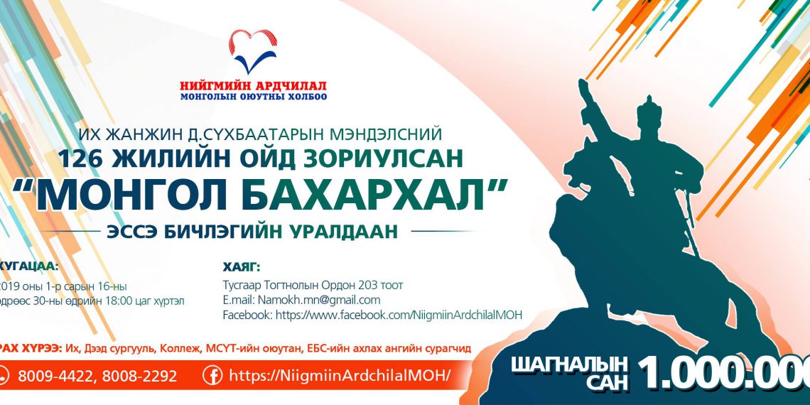 Их Жанжин Д.Сүхбаатарын мэндэлсний 126 жилийн ойг ирэх 2-р сарын 2-ны өдөр тэмдэглэн өнгөрүүлнэ. Ойн хүрээнд Нийгмийн Ардчилал Монголын Оюутны холбооноос Их, Дээд сургууль, Коллеж, МСҮТ-ийн оюутан, Ерөнхий боловсролын сургуулийн ахлах ангийн сурагчдын дунд “Монгол бахархал” сэдвийн хүрээнд эссэ бичлэгийн уралдааныг зарлаж байна.