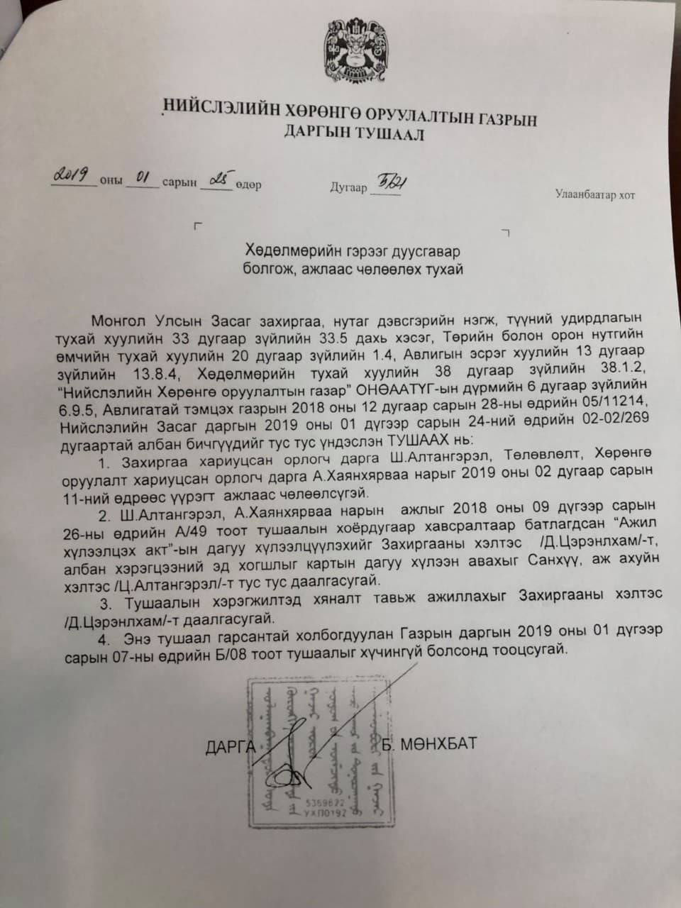 Нийслэлийн Хөрөнгө оруулалтын газрын дарга Б.Мөнхбатын тушаалаар АТГ-т хөрөнгө орлогоо зөрүүтэй мэдүүлсэн албан тушаалтнуудад хариуцлага тооцжээ. Тэрээр Нийслэлийн Хөрөнгө оруулалтын газрын орлогч дарга нар болох Ш.Алтангэрэл, А.Хаянхярваа нарыг үүрэгт ажлаас нь чөлөөлсөн байна.