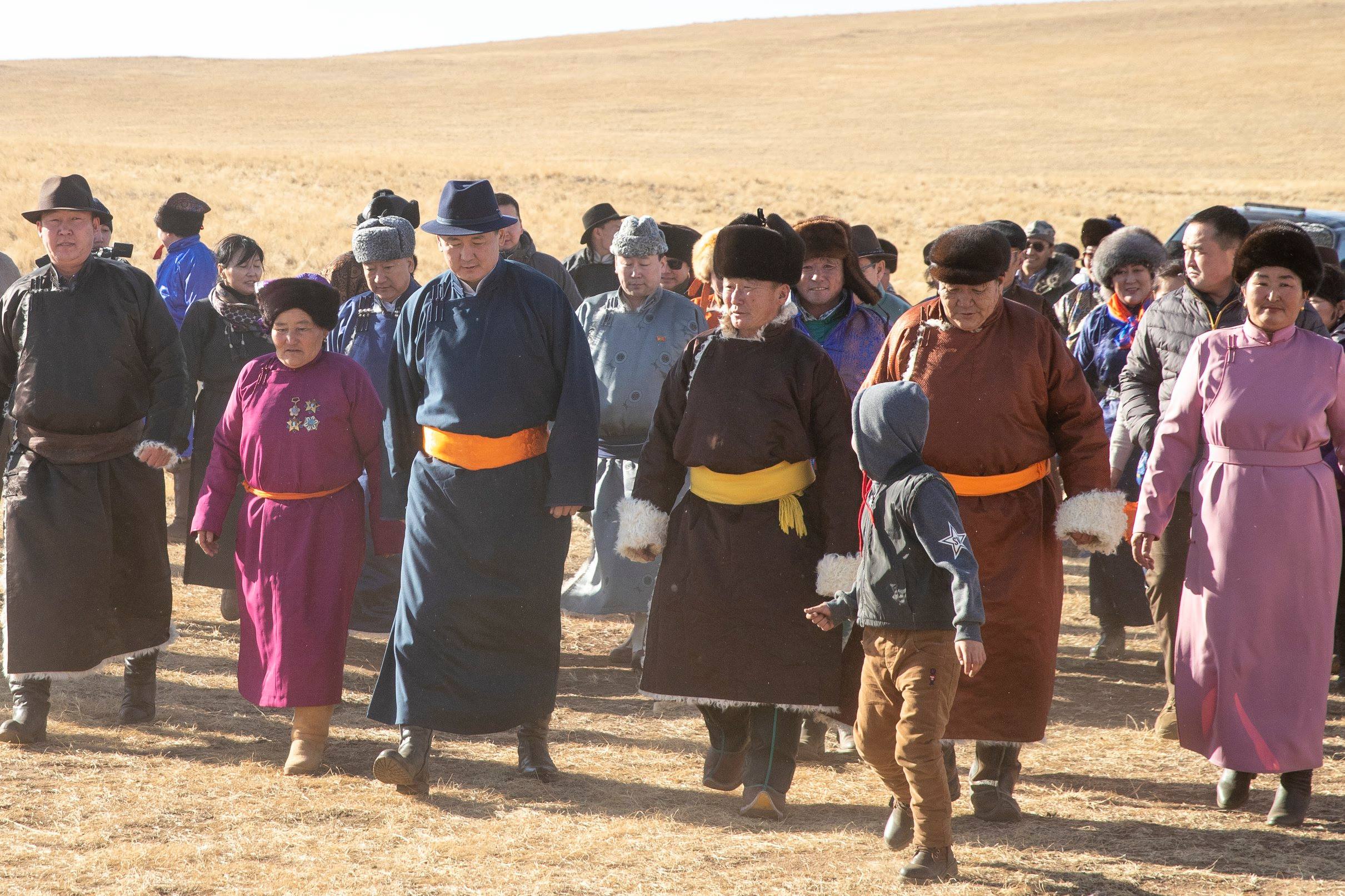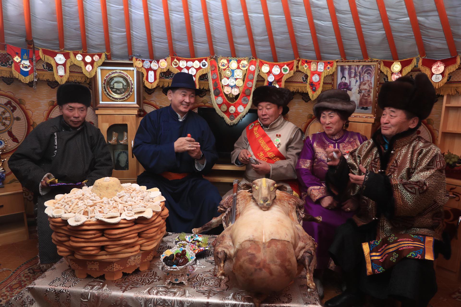 Монгол Улсын Ерөнхий сайд У.Хүрэлсүх Сүхбаатар аймгийн Сүхбаатар сумын дөрөвдүгээр багийн малчин Шагдарын Өвгөнхүүд Улсын аварга малчин цол тэмдгийг нь гардуулж өглөө.