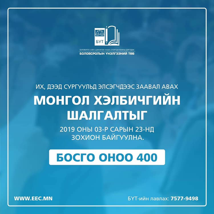 Боловсрол, соёл, шинжлэх ухаан, спортын сайдын тушаалаар энэ жилээс эхлэн их, дээд сургуульд элсэгчдээс заавал авах Монгол хэл, бичгийн шалгалтын босго оноог 400 байхаар тогтоолоо. Өмнө нь энэхүү шалгалтыг ЭЕШ-ын өмнөх өдөр, босго оноогүй зохион байгуулдаг байсан. Монгол хэл бичгийн шалгалтыг 2019 оны гуравдугаар сарын 23-ны өдөр зохион байгуулна.