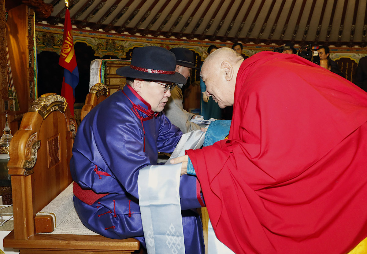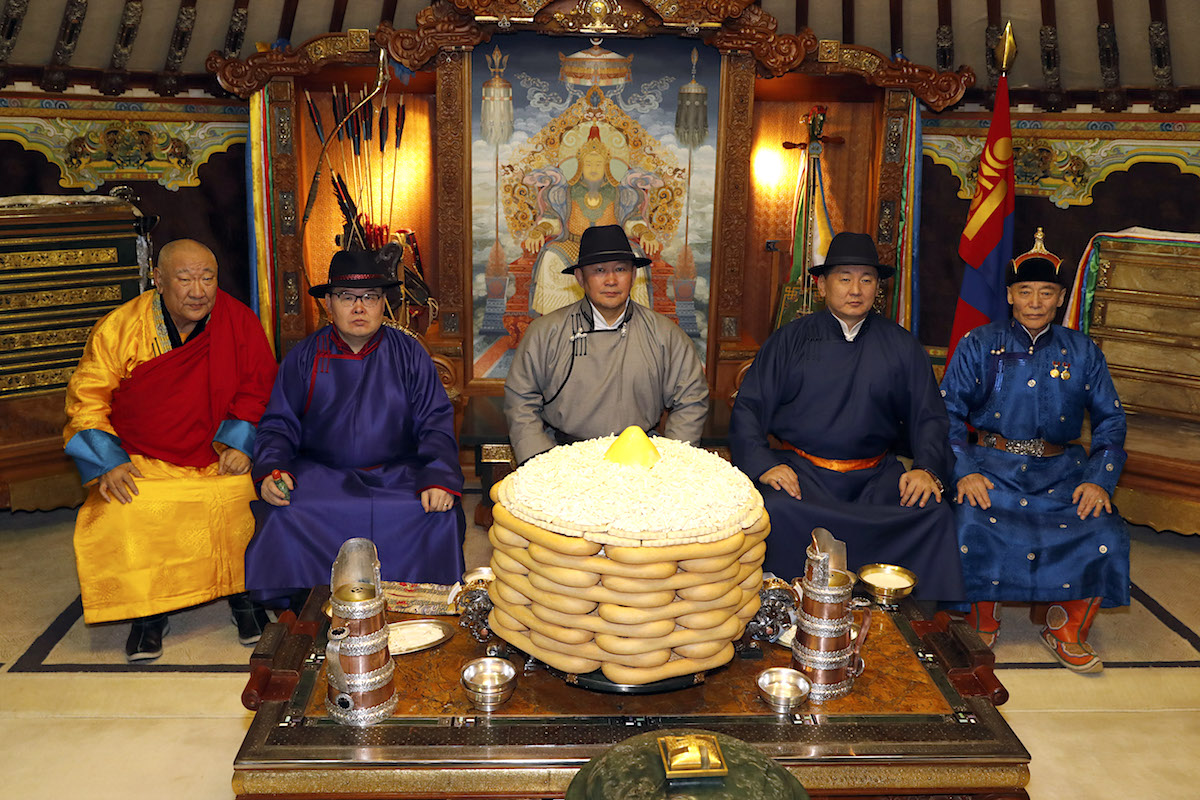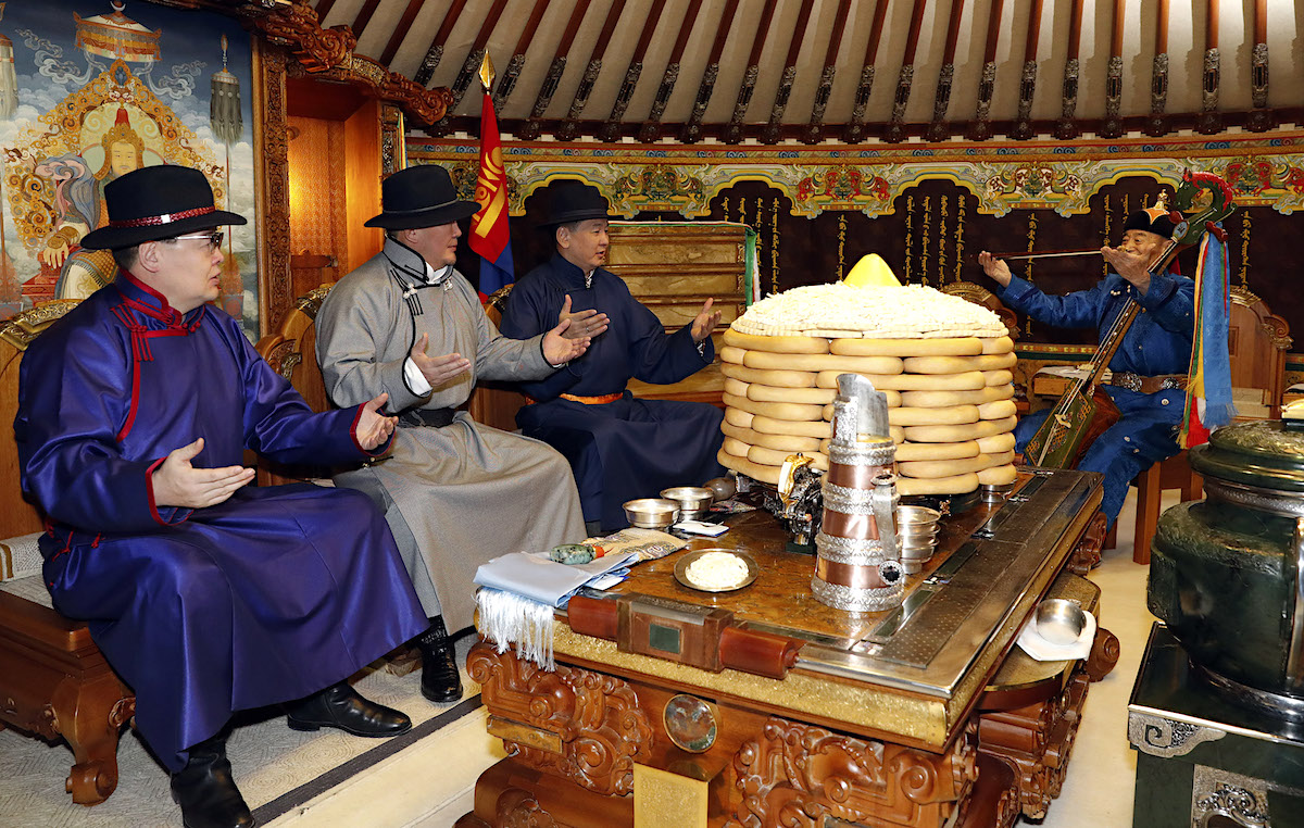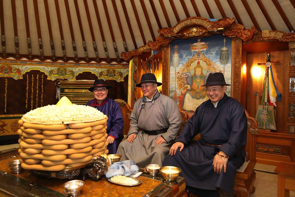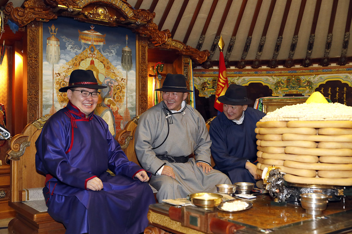 Үүний дараа Төрийн ёслол хүндэтгэлийн өргөө гэрт Монгол Улсын Их Хурлын дарга Г.Занданшатар, Монгол Улсын Ерөнхий сайд У.Хүрэлсүх нар алд цэнхэр хадаг дэлгэн Төрийн тэргүүний амар мэндийг айлтган золгож, хөөрөг зөрүүлэн мэнд мэдэлцэж, налгар хавартай золгож байгаа талаар ярилцлаа.