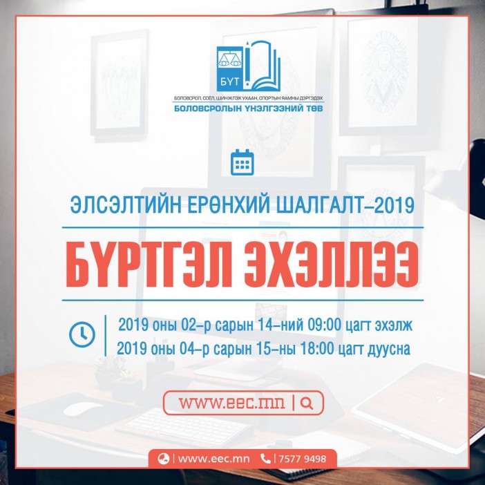 Монгол улсын хэмжээнд их, дээд сургуульд элсэгчдийн мэдлэгийн түвшинг тогтоох зорилготой “Элсэлтийн ерөнхий шалгалт” –ын онлайн бүртгэл www.eec.mn цахим хуудсаар орон даяар эхэллээ. Бүртгэлийг Улаанбаатар хотын цагаар 2019 оны 02-р сарын 14-ний өглөө 09:00 цагт эхэлж, 2019 оны 04-р сарын 15-ны 18:00 цагт дуусна.