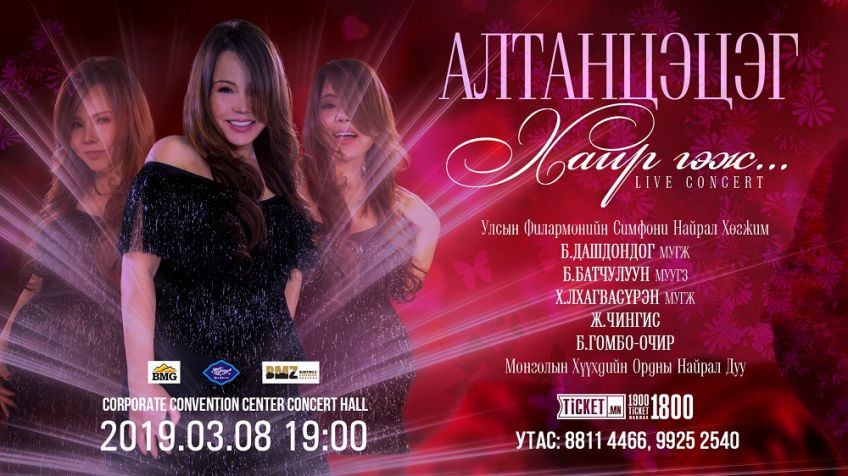 Монгол Улсын гавьяат жүжигчин, поп дива Ж. Алтанцэцэг Олон улсын эмэгтэйчүүдийн эрхийг хамгаалах өдөр буюу “Март 8”-нд “Корпорэйт” конвеншн центрт “Хайр гэж…“ шинэ, амьд тоглолтоо хийнэ. 2013 онд хамгийн сүүлд “Алтанцэцэг” тоглолтоо хийснээс хойш үзэгчидтэйгээ уулзаагүй байгаа түүнд үзэгч, фенүүддээ тайлагнах олон шинэ уран бүтээл байгаа нь гарцаагүй юм.