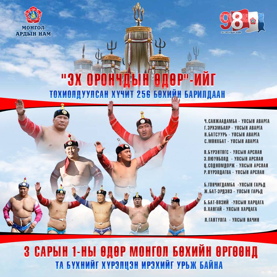 Өнгөрсөн жилийн барилдаанд Архангай аймгийн Чулуут сумын харьяат, улсын начин Б.Амарзаяа түрүүлж, Хэнтий аймгийн Өмнөдэлгэр сумын харьяат, улсын арслан Э.Оюунболд үзүүрлэсэн билээ. Их шөвөгт Архангай аймгийн Эрдэнэбулган сумын харьяат, улсын арслан Р.Пүрэвдагва, Сэлэнгэ аймгийн Мандал сумын харьяат, улсын начин Ч.Баянмөнх нар шалгарсан юм.