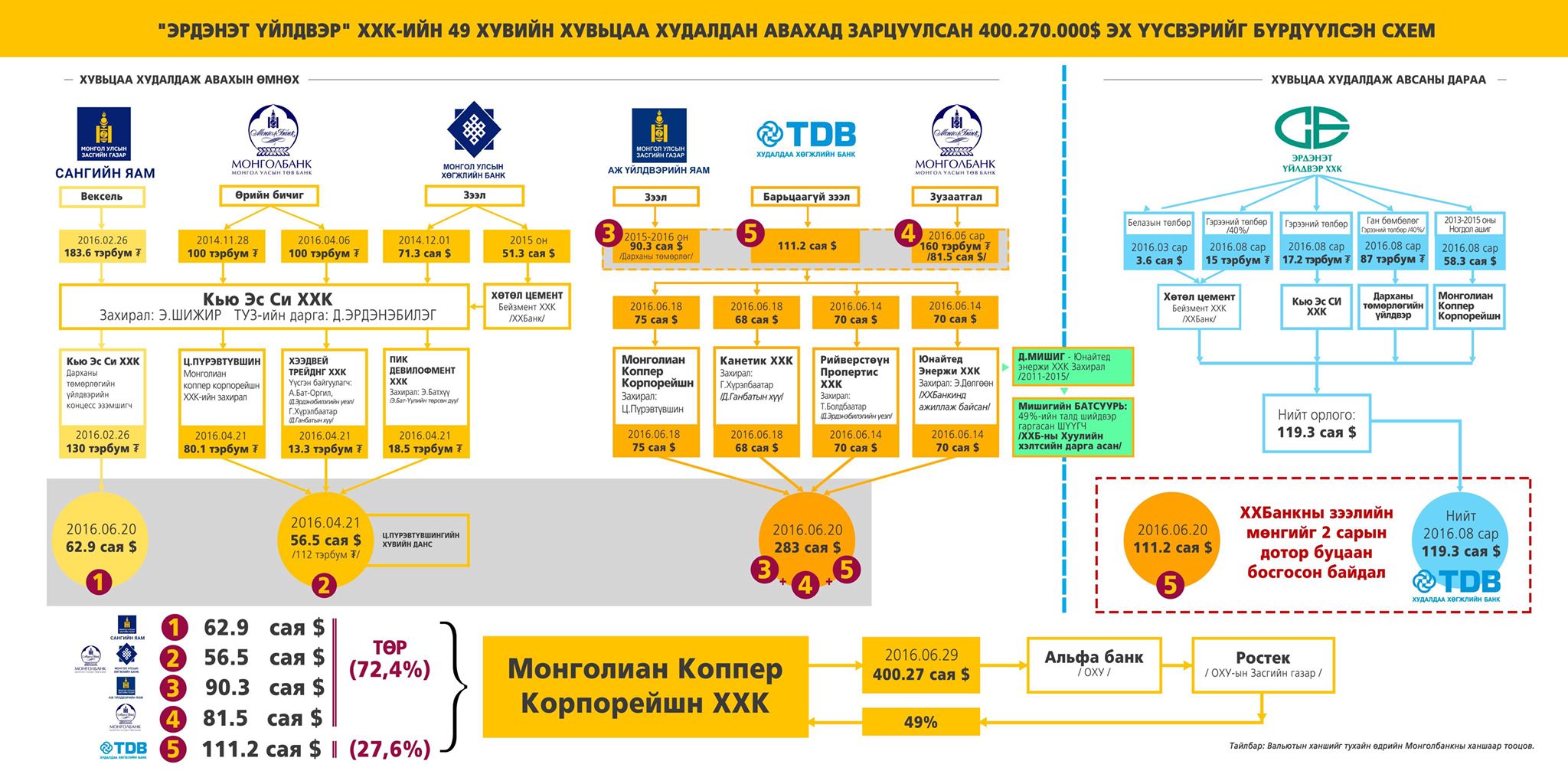 “Эрдэнэт үйлдвэр” компанийн 49 хувийг авах боломж тухайн үеийн Засгийн газарт байсаар байхад үүнээсээ татгалзаж, хувийн аж ахуйн нэгжид давуу байдал олгосон. 49 хувийг худалдан авсан 400 гаруй сая ам.долларын 72.4 хувийг төрөөс, үлдэх 27.6 хувийг Худалдаа хөгжлийн банк гаргасан байх магадлалтай. Энэ схемийг хууль хяналтын байгууллага шалгаж тогтоосны дараа Засгийн газар “Монголиан коппер корпорэйшн” компанитай хэлцлийн ширээний ард суух боломжтой” гэж сайд, Засгийн газрын Хэрэг эрхлэх газрын дарга Л.Оюун-Эрдэнэ хэлэв.