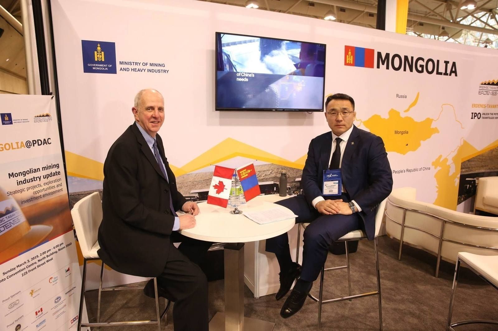 Mongolia@PDAC2019 арга хэмжээний нээлтэд Монгол Улсаас Канад улсад суугаа Онц бөгөөд Бүрэн эрхт Элчин сайд Я.Ариунболд, Канад улсаас Монгол Улсад суугаа Онц бөгөөд Бүрэн эрхт Элчин сайд Дэвид Спрул, УИХ-ын гишүүн А.Ундраа нар үг хэлж, Уул уурхай, хүнд үйлдвэрийн сайд Д.Сумъяабазар “Монгол Улсын уул уурхайн салбарын бодлого, хөгжил” сэдэвт илтгэл тавив.