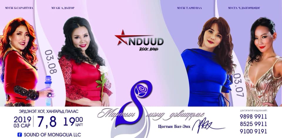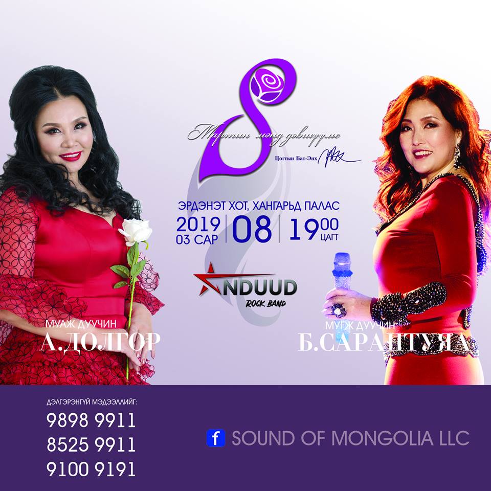 Харин 3-р сарын 8-ны 19 цагт МУАЖ Дуучин А.Долгор, МУГЖ Дуучин Б.Сарантуяа, Андууд хамтлагийн хамтарсан тоглолт  тоглогдохоор болжээ.