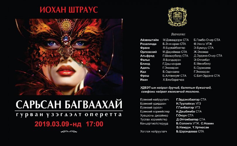 Улсын дуурь, бүжгийн эрдмийн театрын уран бүтээлчид И.Штраусын “Сарьсан багваахай” гурван үзэгдэлт операттаг гуравдугаар сарын 9-ний өдөр тоглохоор болжээ. Тус тоглолтын ерөнхий найруулагчаар Г.Эрдэнэбаатар ажиллаж байгаа бол ерөнхий зураачаар Урлагийн гавьяат зүтгэлтэн Г.Ганбаатар, удирдаачаар Урлагийн гавьяат зүтгэлтэн Н.Туулайхүү ажиллаж байна.